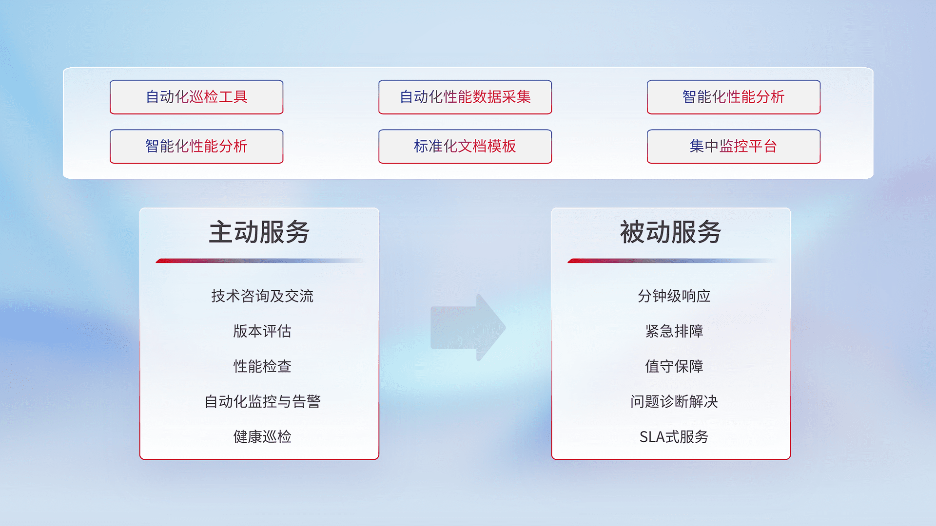 智能化工具和标准化文档,,,,保障服务质量,,,,提供主动服务(包含技术咨询、、、版本评估、、、性能检查、、自动化监控与告警、、、、健康巡检)和被动服务包含(分钟级响应、、、紧急排障、、、、值守保障、、、问题诊断解决、、、、SLA服务)。。。。