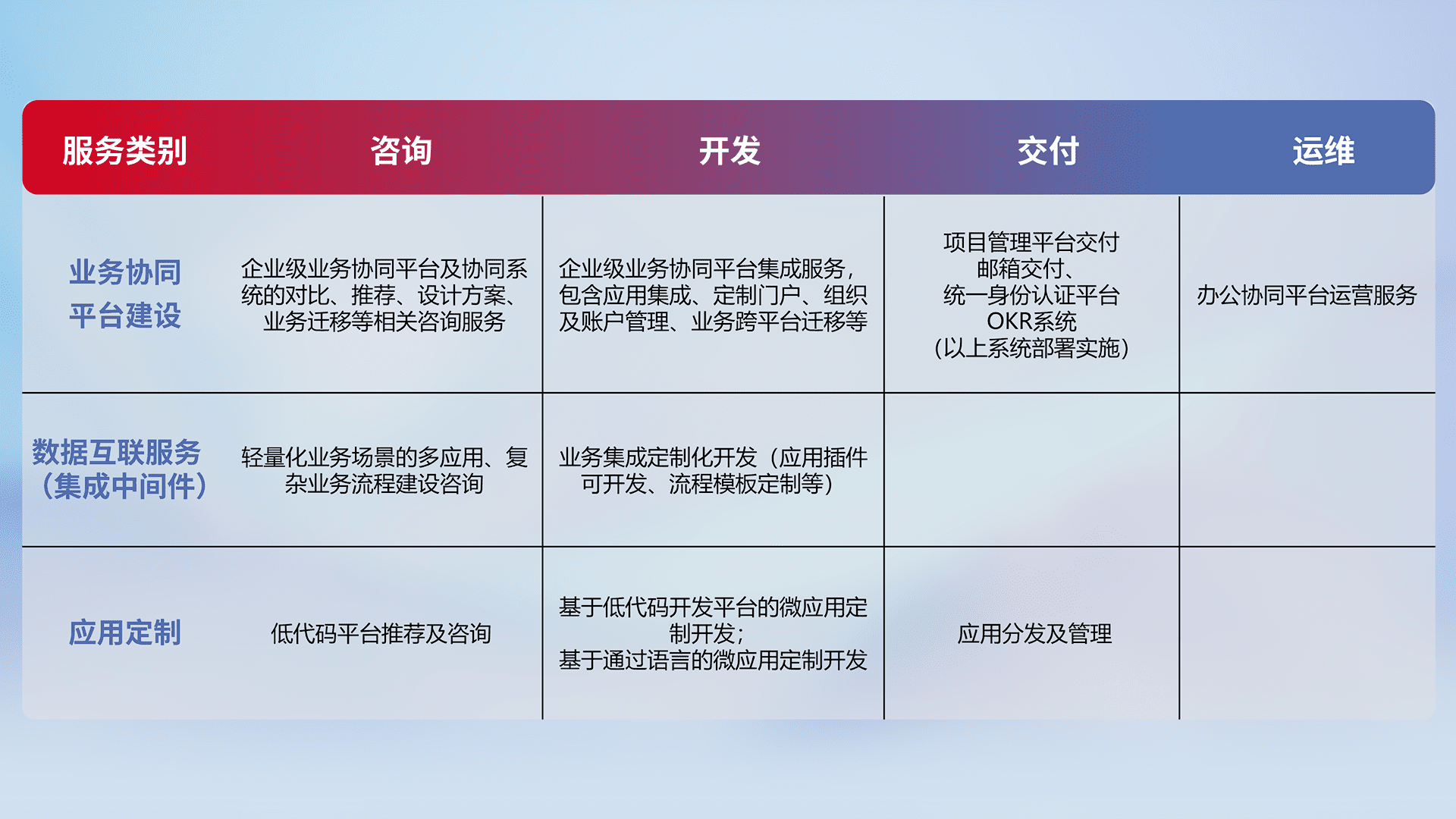 针对钉钉、、、、企微、、IDaas等平台级产品提供产品的规划、、方案、、交付、、、定制化开发等服务,,,,实现如统一协同办公、、智能客户服务、、、混合会议管理、、智能数据查询、、、、等业务场景,,,实现数字化转型。。